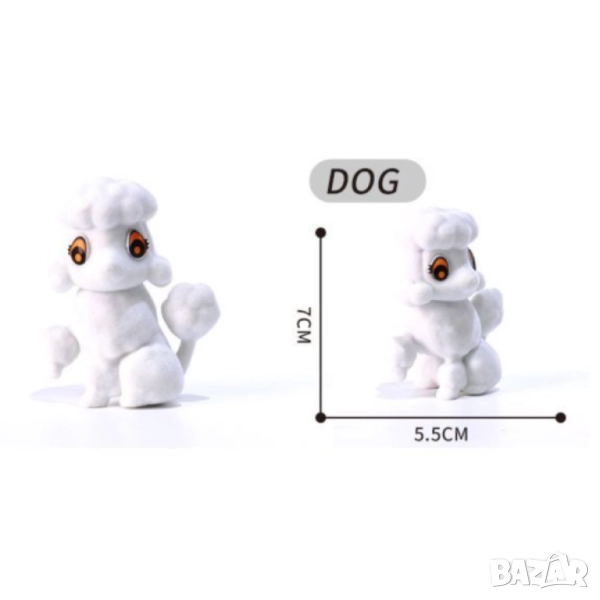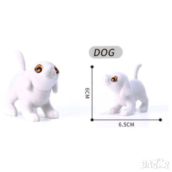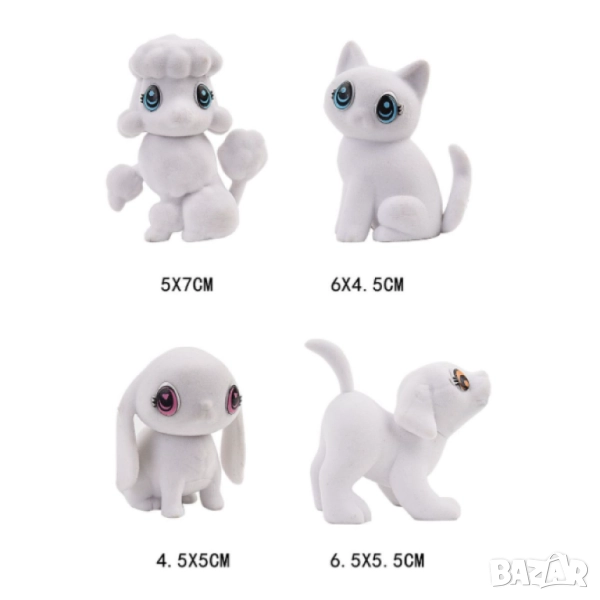 Комплект животинки с възможност за постоянно персонализиране / Размери: Размер на пуделчето: 5х7 см; Размер на кученцето с вирната опашка: 6,5х5,5 см; Размер на котето: 6х4,5 см; Размер на зайчето: 4,5х5 см; Размер на маркерите: 10,5 см; Размер на четчицата: 7 см; Размер на цялата кутия: 32,5х23,5 см; Цвят на животинките: Бял основен цвят; Цвят на маркерите: По един от всеки от следните цветове – жълт, лилав, светло зелен, червен, оранжев, светло син;