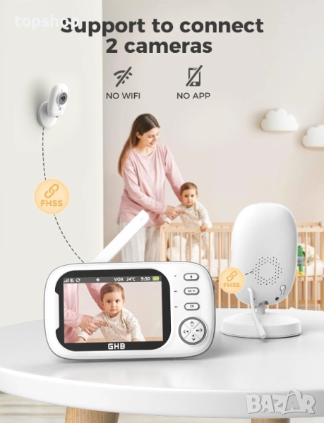2.4 GHz безжична технология: Нашият бебефон с камера използва подобрена 2.4 GHz технология за връзка (не се изисква Wi-Fi или приложение), за да осигури поверителна връзка. Това ви позволява да се занимавате с други задачи свободно и уверено, докато вашето очарователно бебе спи.