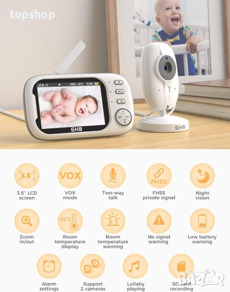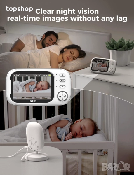 Нов 3.5 инчов бебефон GHB ABM 600 с камера и нощно виждане, VOX режим, двупосочен разговор, песни...