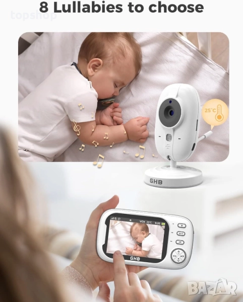Нов 3.5 инчов бебефон GHB ABM 600 с камера и нощно виждане, VOX режим, двупосочен разговор, 8 приспивни песни, температурен сигнал, напомняне за хранене
