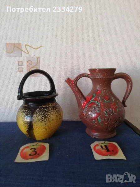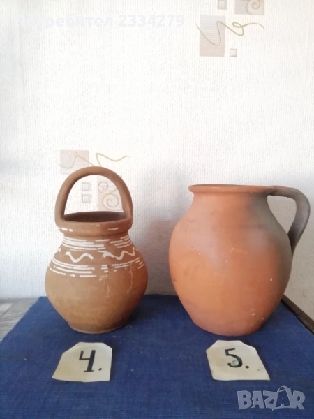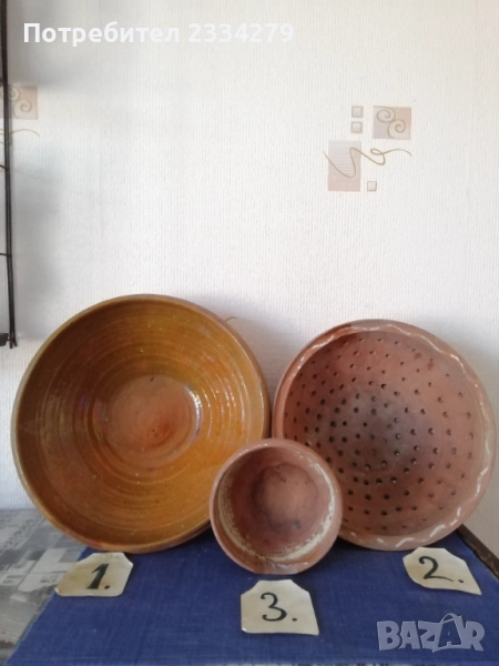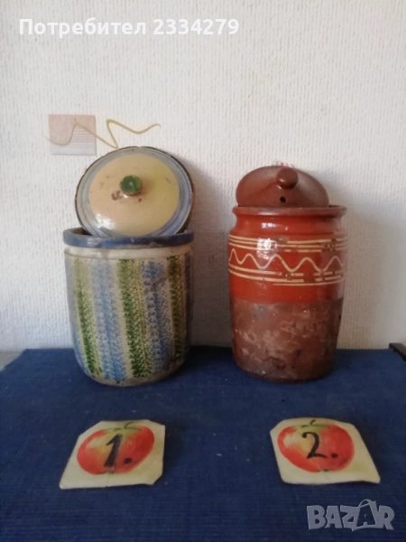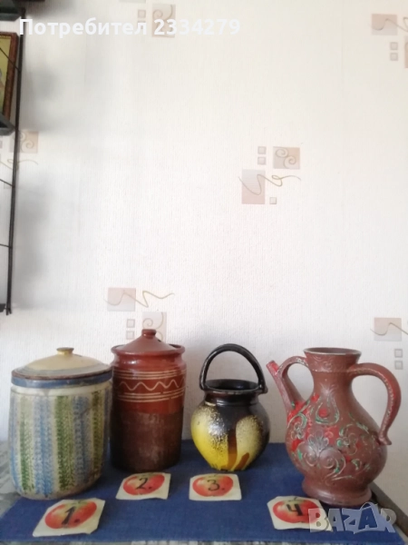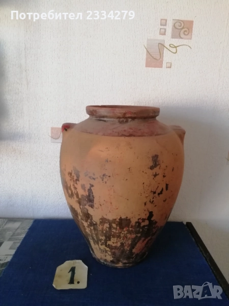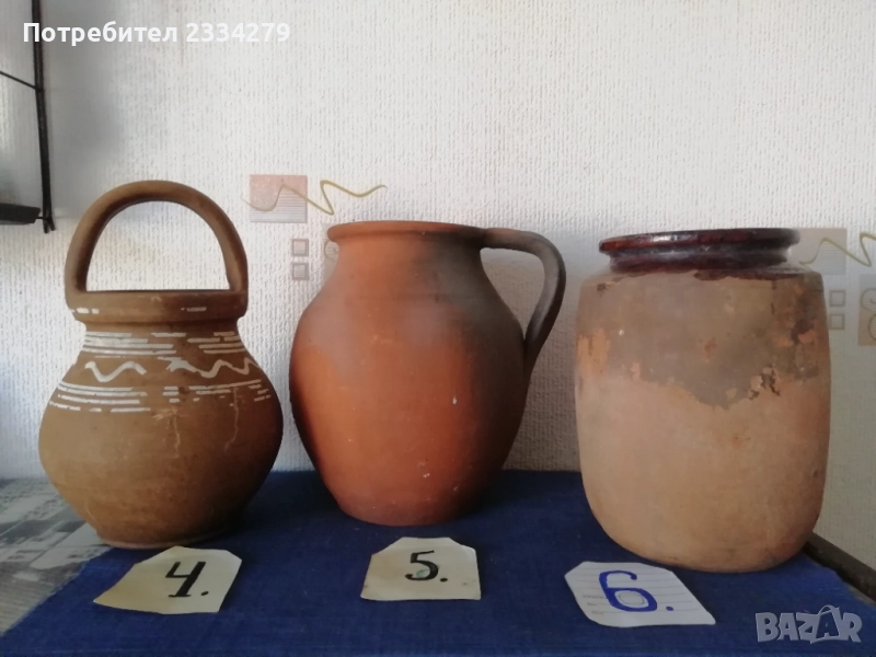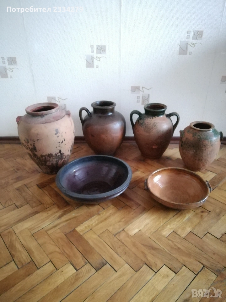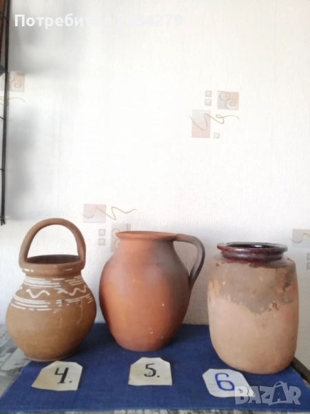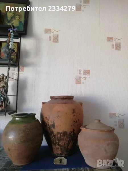 делва гърнета. N:1 голяма делва с орнаменти и размери 37х29см., цена 27€., N:2 гърне делва, глинджосана, орнаментирана ръчна изработка( липсва малко парченце на отвора, размер 26х23см., цена 15€.; N:3 делва гърне с капак, размер 24х22см., цена 17€.; N:4 гърне с дръжка отгоре,,ръкатка" ръчна стара орнаментирана рисувана изработка, размери 27х16см., цена 23€.; N:5 автентично много добре запазено глинено гърне с размери 29х23см., цена 17€.; N:6 глинен съд използван в миналото за туршия, масло, мед и други, размери 22х17см., цена 15€. МАЛКИ СЪДОВЕ ГЪРНЕТА, ДОЗИ: N:1 стар над 100 годишен глинен съд от Северна България, нещо като глинена доза, буркан, гърне с капак, ръчно изработен изрисуван глинджосан, размери 20х15см., цена 17€.; N:2 глинено гърне буркан доза, автентична с капак, ръчно рисувана, глинджосана, размер 22х13см.,цена 10€.; N:3 малко гърне ръката изработено и оцветено ръчно от троянски майстор през 70-те години., да змери 21х13см., цена 7€.; N:4 Ръчно изработен и релефно орнаментиран кронтир, бърдук с размери 20х20см., цена 5€.; КУПИ-ГЮВЕЧ И ГЕВГИРИ, ГЛИНЕНИ: N:1 стар глинен съд, голяма купана, гювеч, ръчна стара масивна глинджосана изработка с размери 32х12см., цена 17€.; N:2 стара цедка гевгир сито, ръчна грънчарска изработка глинджосана с размери 29х10см., цена 13€. Всичко може да се ползва или декорация за битова къща, механа заведение.