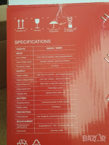 UPS е чисто нов в кашон неизползван . Обявата важи само за Стара Загора Ето характеристики : Непрекъсваемо токозахранване /UPS/ HIKVISION DS-UPS3000: 3000VA - 1800 Watt, Line Interactive технология, симулирана синусоида, 4 x Шуко изходящи контакта, 4 батерии 12V/9 Ah Line Interactive технология с автоматичен волт регулатор за стабилизиране на изходящото напрежение. Капацитет: 3000 VA. Максимална мощност: 1800 W. Технология: Line Interactive. Батерия: 4 бр. 12V/9 Ah. Изходяща синусоида: PWM симулирана. AC изходи: 4 бр. шуко контакта CEE 7/3. Входящо напрежение: 140-290 VAC. Честота на входящото напрежение: 50/60 Hz. Изходящо напрежение: 210-235 VAC. Честота на изходящото напрежение: 50/60 Hz ± 0.5 Hz. Изходящ фактор на мощността: pF 0.6. Време за реакция: 10 ms. Време за зареждане: 6-8 часа до 90%. Дисплей: LCD екран. LСD индикации: входящо и изходящо напрежение, капацитет на батерията, ниво на натоварване Аларми: звукови аларми. в режим на батерия (DC)- на всеки 8 секунди изтощена батерия - на всяка секунда при претоварване - 2 пъти в секунда при повреда - непрекъсната аларма RJ-45 защита: ДА. USB порт: ДА. Защити: от пренапрежение, от претоварване, от късо съединение, от разреждане на батерията. Автоматичен старт при възстановяване на захранването. Не работи с допълнителни външни батерии. Охлаждане: с вентилатор. Работна температура: 0 ~ +40°C. Тегло: 18.5 кг. Размери: 412x145x210 mm. Време на работа на батерии при натоварване от: 100W - 150 мин., 600W - 15 мин., 900W - 6 мин.