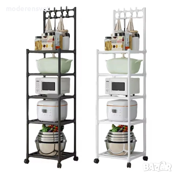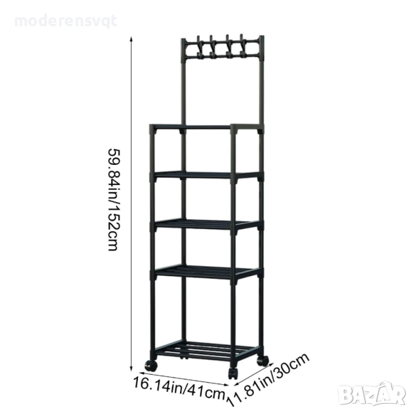 - Тип продукт: Пететажна метална етажерка с куки и колелца.