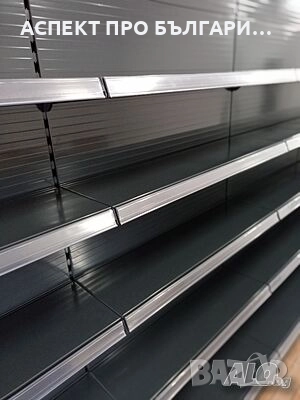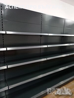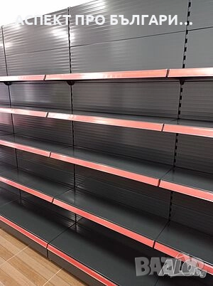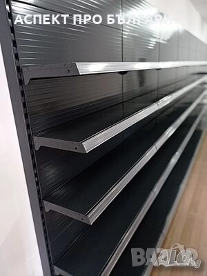 Крайстенни метални стелажи с височина 1,95м, основен рафт 100см х 40см и четири допълнителни рафта 100см х 30см, плътни гърбове, ценови ленти, колона с пета и декоративно чело - долно. Цвят: графит / RAL 7016 /