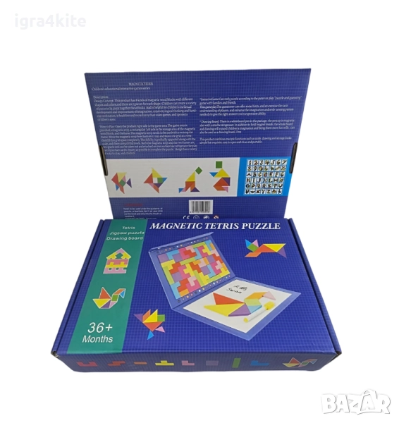 * 7 броя дървени магнитни танграми - невероятно интересна геометрична забава, която упражнява уменията за решаване на загадки.