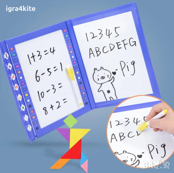 Иновативна детска дигитална магнитна тетрадка - Магнитната двустранна книга с маркер за писане и триене + дървени магнитни блокчета и магнитен танграм!