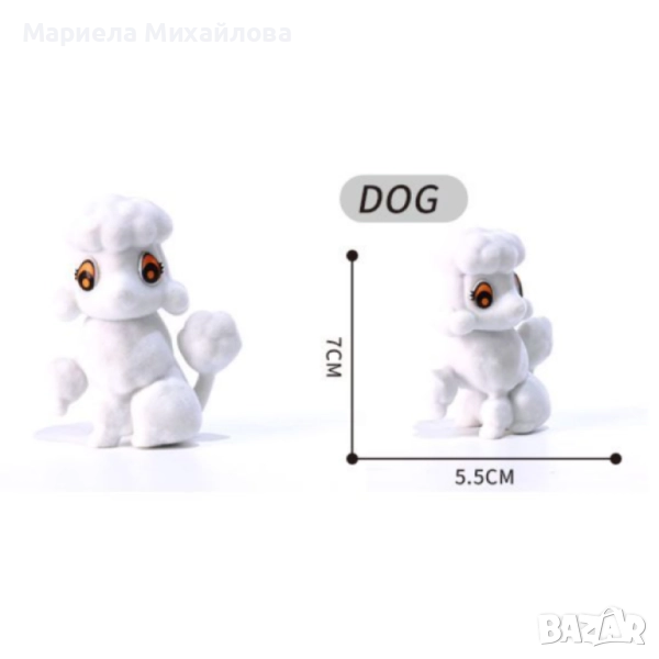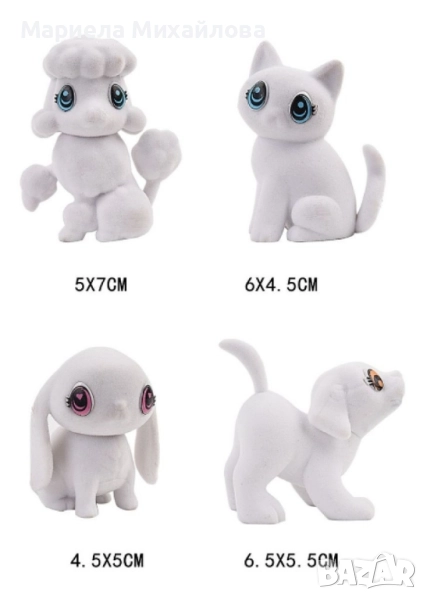 Комплект животинки с възможност за постоянно персонализиране / Размери: Размер на пуделчето: 5х7 см; Размер на кученцето с вирната опашка: 6,5х5,5 см; Размер на котето: 6х4,5 см; Размер на зайчето: 4,5х5 см; Размер на маркерите: 10,5 см; Размер на четчицата: 7 см; Размер на цялата кутия: 32,5х23,5 см; Цвят на животинките: Бял основен цвят; Цвят на маркерите: По един от всеки от следните цветове – жълт, лилав, светло зелен, червен, оранжев, светло син;