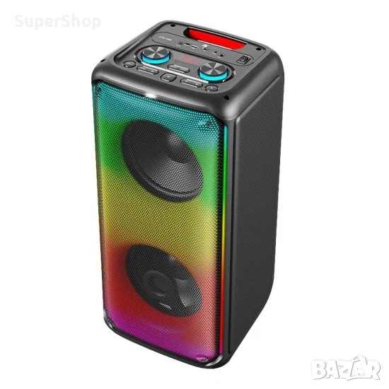 Колоната е снабдена с акумулаторна батерия, която след пълно зареждане пълното, ще ви осигури дълго време да се наслаждавате на вашата любима музика. Имате възможност да се свържете 2 такива колони с 1 телефон за стерео звук чрез TWS функцията безжично, благодарение на Bluetooth функцията с която разполага колоната. Други опции да слушате музика имате чрез SD карта или да сложите флашка в USB входа. За пълната наслада от купона в комплекта имате на разположение 2 безжични микрофона, така забавлението ще е на макс.