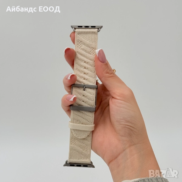Елегантна плетена найлонова каишка, проектирана за Apple Watch Ultra 49 mm, водоустойчива и с титаниева катарама.