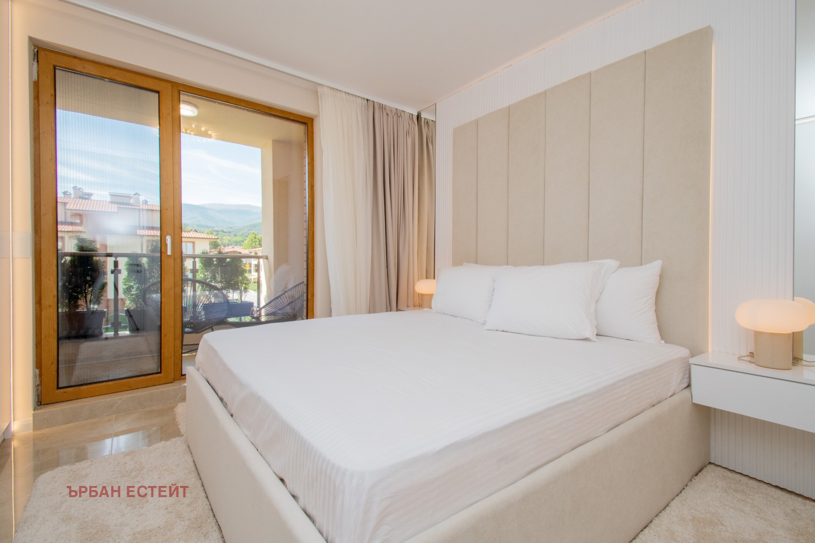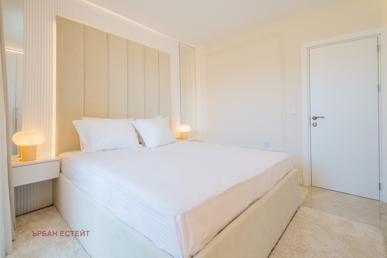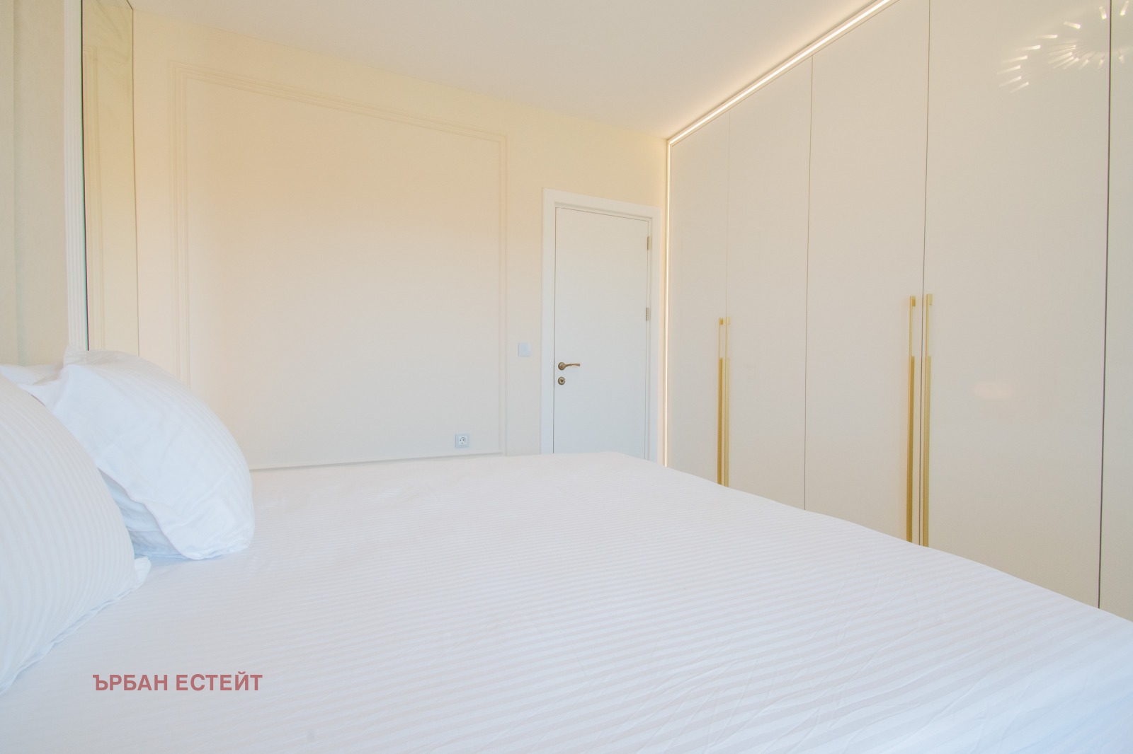 -Спалня с дизайнерско легло и изцяло вграден гардероб по протежение на стената;