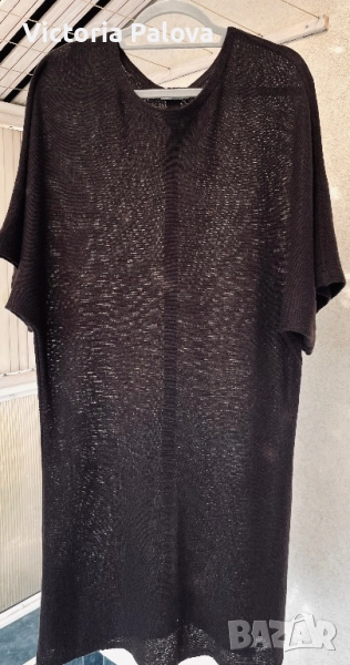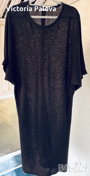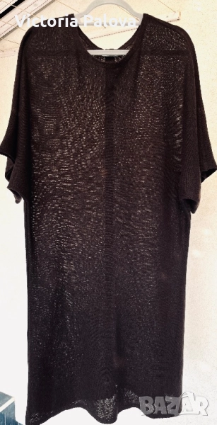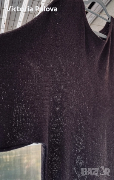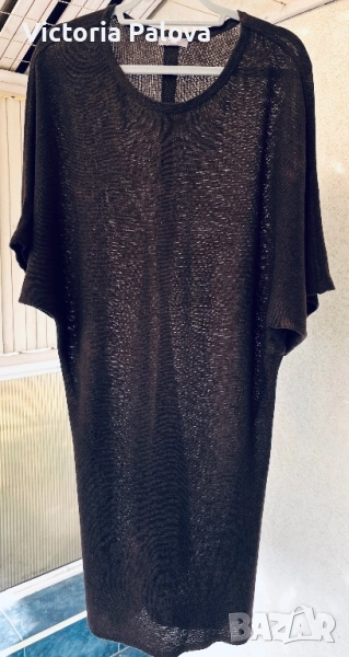 кашмир с наситен шоколадов нюанс - рядка бутикова находка за ценители на истинския лукс и минималистична елегантност, които търсят уникални скъпи и внимателно изработени модели, които се отличават сред масовите предложения. Моделът е без шев по рамото, с батвинг ръкав, който пада леко и създава изискан силует. Поради фината и рехава материя роклята притежава лека прозрачност, която добавя деликатност и чувственост на визията. По гърба роклята е украсена с перлени седефени копчета, които придават изтънчен завършек и правят дизайна уникален и впечатляващ. ГО - 60см, дължина - 103см.