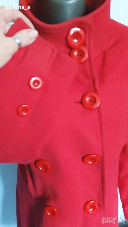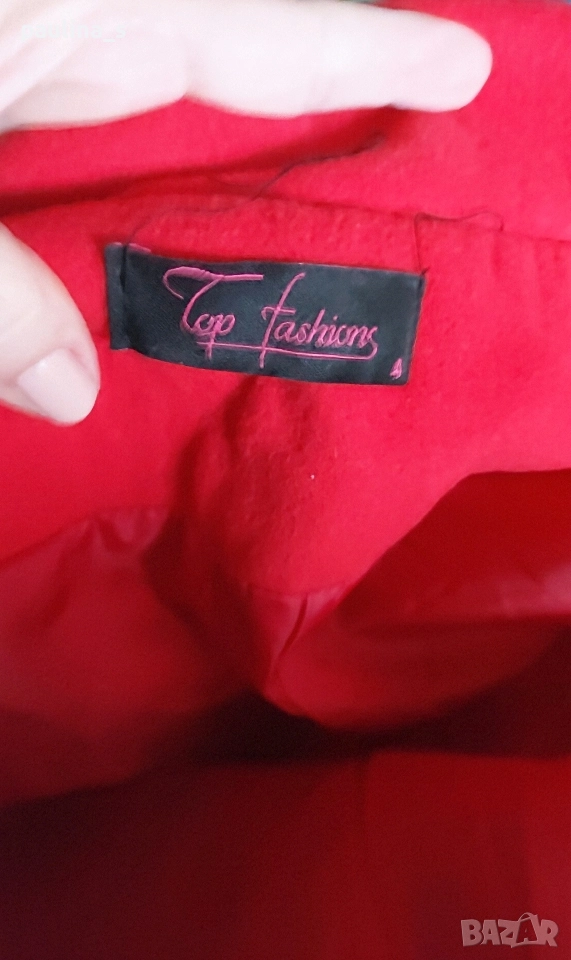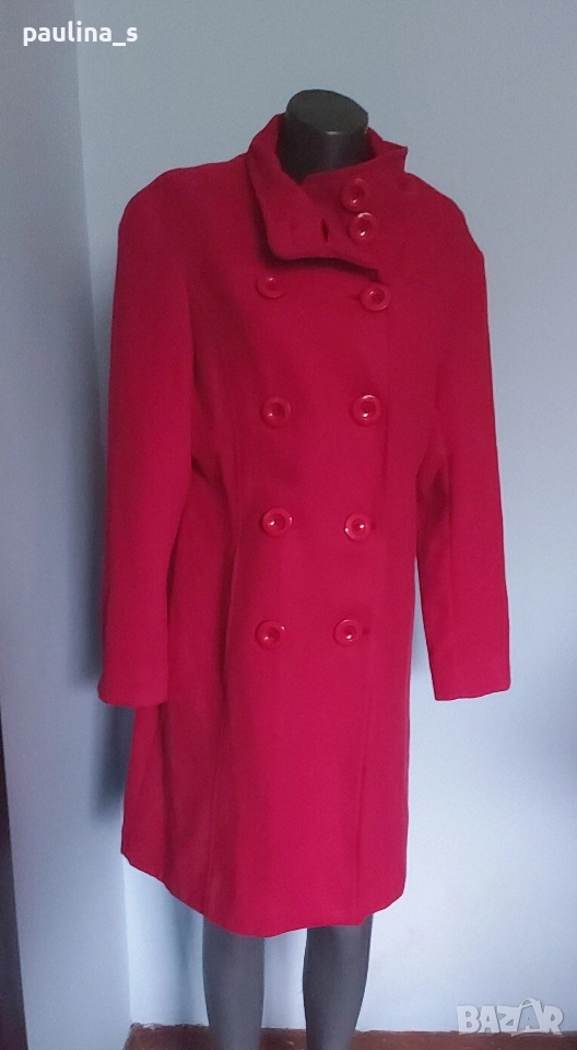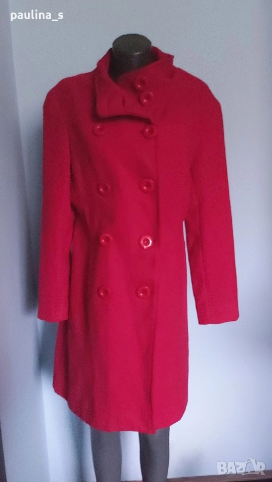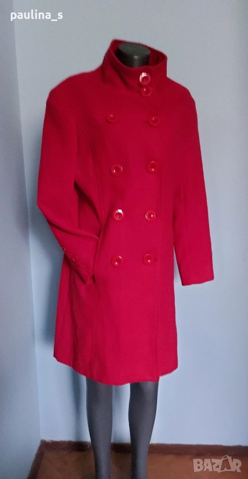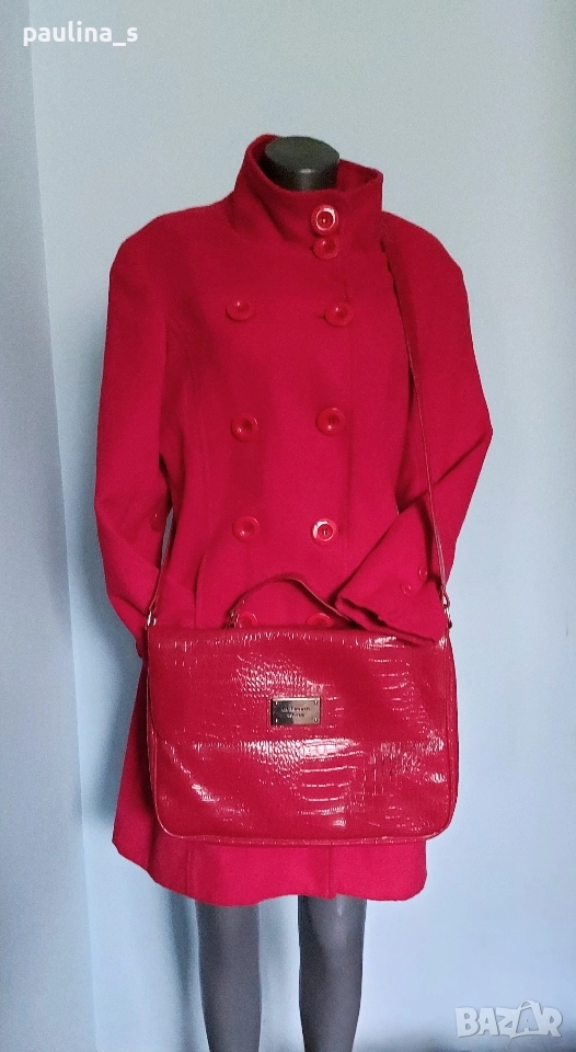 2️⃣. L / XL - "Top fashions". Цената е крайна, без пазарлъци 59,99лв / 30 евро. Дамско палто с високо съдържание на вълна и кашмир. Цветът е малинено червен, много красив нюанс. Материята е разкошна на допир. Моделът е с висока яка, двуредно закопчаване, джобовете са в предните тегели, втален силует с цепка отзад. Без дефекти и етикет за състава, съобразена цена. Чантата е на "Liz Claiborne" и е за лаптоп, но може да се ползва и като дамска. При желание, ще генерирам отделна обява за нея.