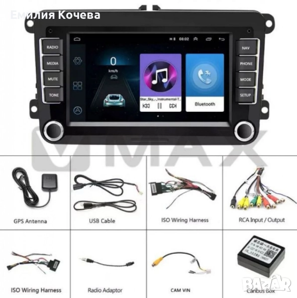 Операционна система: Android 13; Процесор: A7 1.3 GHz четириядрен; Дисплей: 7 инча, резолюция 1024 x 600; RAM: 4GB; Съхранение: Вътрешна памет 32GB с възможност за разширение чрез USB и SD карти; Wi-Fi: Вграден Wi-Fi модул; Bluetooth: Версия 4.0, с поддръжка на телефонен указател и гласови повиквания; Мощност: 4х80W; Захранване: 12V. Съвместима Volkswagen: Пасат B6 и B7, Passat CC (2008-2011 г.), Голф 5 и 6, Tiguan (2007-2011 г.), Touran (2003-2011 г.), Caddy (2004-2011 г.), Jetta (2005-2011 г.), T5 Transporter (2010-2015 г.), Seat (изисква адаптерна рамка в някои случаи):, Леон (2005-2010 г.), Толедо (2004-2009 г.), Алхамбра (2010-2011 г.), Skoda (изисква адаптерна рамка в някои случаи):, Octavia II (2004-2009 г.), Fabia (2004-2009 г.), Roomster (2006-2010 г.), Yeti (2009-2011 г.) доставка с Еконт