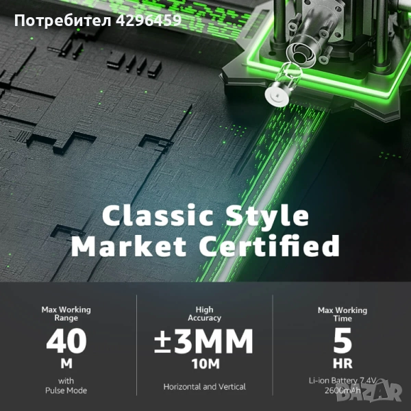 Лазерен нивелир Huepar S04CG е иновативно високотехнологично устройство, предназначено за точно и ефективно измерване. Този нивелир е с подобрени характеристики, които го правят отличен избор за всеки професионалист, който държи на прецизността в измерванията. Той разполага с LCD дисплей с подсветка за лесно отчитане и Bluetooth функционалност за дистанционно управление. Самонивелиращата система осигурява бързо и точно изравняване в рамките на 3 секунди, а вградената литиево-йонна батерия предлага до 5 часа непрекъсната работа, което отменя необходимостта от чести зареждания. Когато все пак е необходимо зареждане, това може да стане по 3 различни начина. Нивелирът е с голям работен обхват от 40 метра, а с приемник и достига и до 60 м. Това осигурява широка зона на действие. Комплектът включва всичко необходимо за веднага да започнете работа.