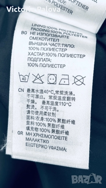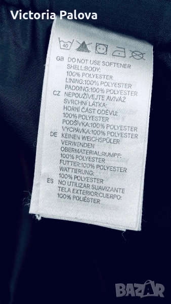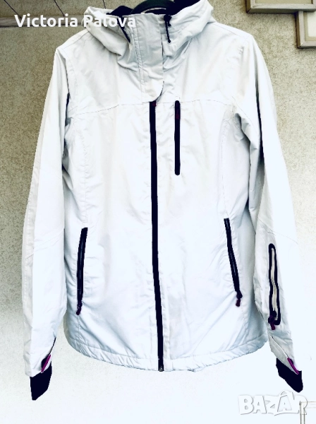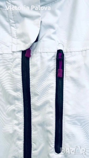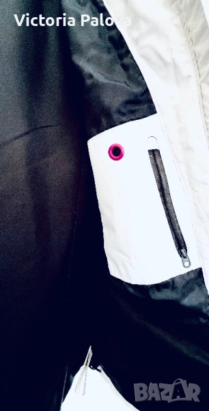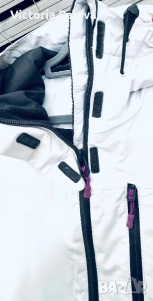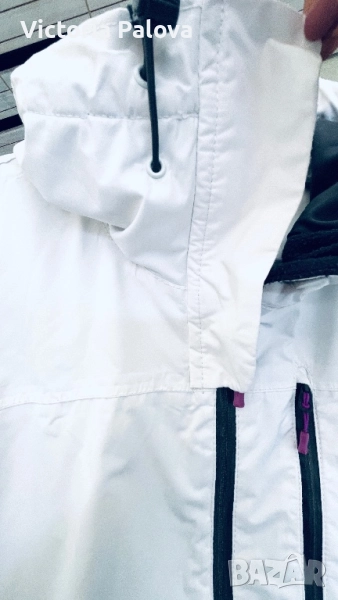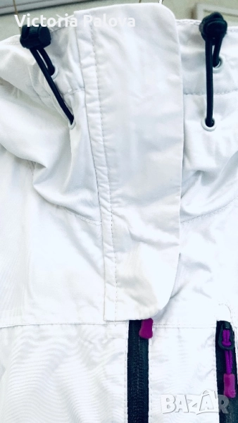 Топло и водоустойчиво зимно яке, идеално за активен отдих или ежедневие в студено време. Бяло с черна подплата и кръгла красива качулка, лилави акценти по циповете и връвчиците. Регулируеми ръкави, защитни маншети за ръкавици, вътрешна подплата за максимална топлина. Рамо - 43см,ГО - 58см, талия - 54см, дължина отпред - 72см, отзад - 78см, ръкав - 64см.