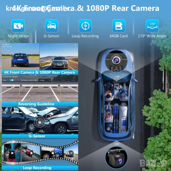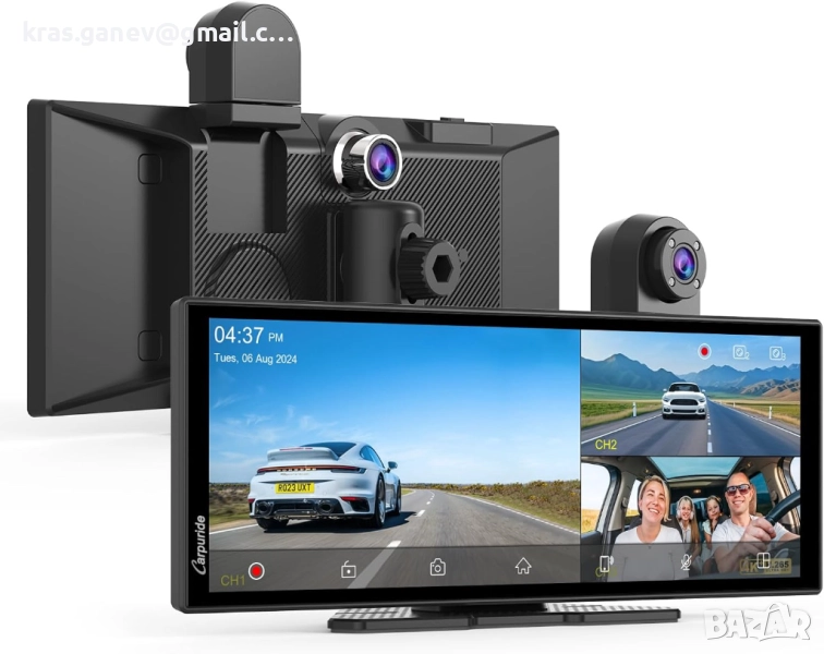 Екранът за кола Carpuride за Apple, оборудван с 11,26-инчов HD сензорен екран с резолюция 1920*720 и поддръжка на 1080P видео възпроизвеждане, можете да се насладите на по-голям екран и отзивчиво докосване, включва 64GB TF карта. С активиран Bluetooth 5.0 за безжични разговори със свободни ръце и стрийминг на аудио, когато е сдвоен с вашия смартфон. Този автомобилен DVR поддържа до 256GB TF карта за достатъчно място за съхранение и има функция за цикличен запис, за да осигури непрекъснат запис. Но включената в пакета TF карта е 64GB. Вграденият G-сензор автоматично заключва важни видео файлове в случай на удар, запазвайки важни доказателства. Функцията за задна камера с един бутон активира мигновено изгледа от задната камера с едно натискане. В комбинация с интегрираните линии за подпомагане на заден ход, тази функция опростява паркирането и повишава безопасността по време на маневри., 4K предна и 1080P задна камера, 1080P инфрачервена камера за кабината, безжичен Carplay и Android Auto, 11.26" HD сензорен екран, цикличен запис, Bluetooth.