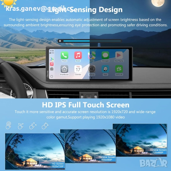 Екранът за кола Carpuride за Apple, оборудван с 11,26-инчов HD сензорен екран с резолюция 1920*720 и поддръжка на 1080P видео възпроизвеждане, можете да се насладите на по-голям екран и отзивчиво докосване, включва 64GB TF карта. С активиран Bluetooth 5.0 за безжични разговори със свободни ръце и стрийминг на аудио, когато е сдвоен с вашия смартфон. Този автомобилен DVR поддържа до 256GB TF карта за достатъчно място за съхранение и има функция за цикличен запис, за да осигури непрекъснат запис. Но включената в пакета TF карта е 64GB. Вграденият G-сензор автоматично заключва важни видео файлове в случай на удар, запазвайки важни доказателства. Функцията за задна камера с един бутон активира мигновено изгледа от задната камера с едно натискане. В комбинация с интегрираните линии за подпомагане на заден ход, тази функция опростява паркирането и повишава безопасността по време на маневри.