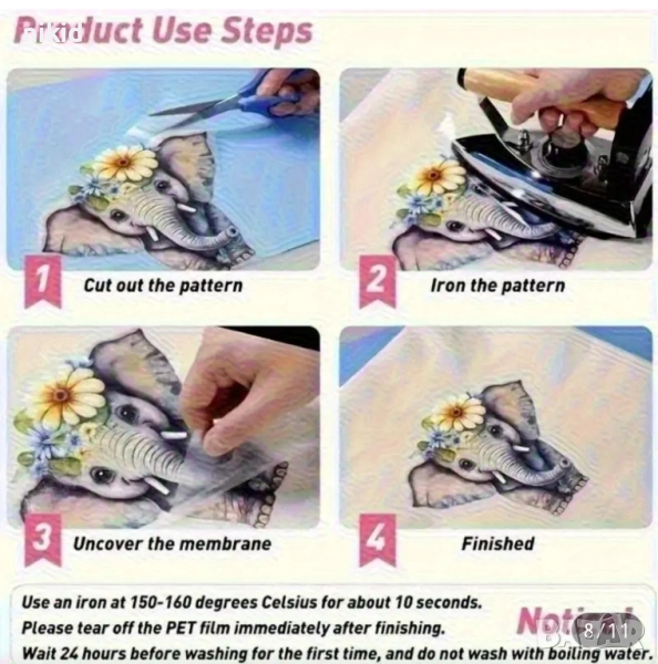 Поставете върху желана дреха -БЕЗ да премахвате защитно фолио , покрийте с парче плат,след което с топла ютия 120-150 градуса за 10-15 секунди минете отгоре ,след което отлепете защитното фолио.
