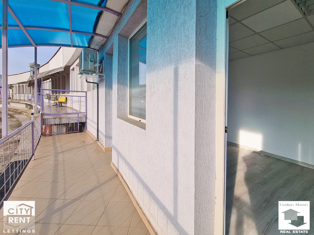 Разположен на трети етаж в нова сграда, имотът се състои от три офис помещения, кухня, просторно входно антре, коридор, складово помещение, две бани с тоалетни и тераса.