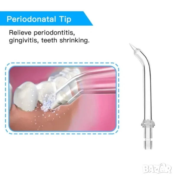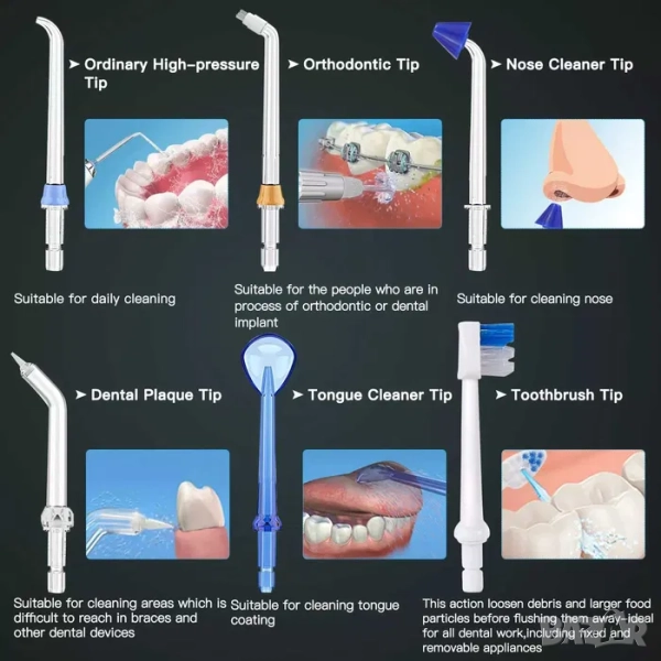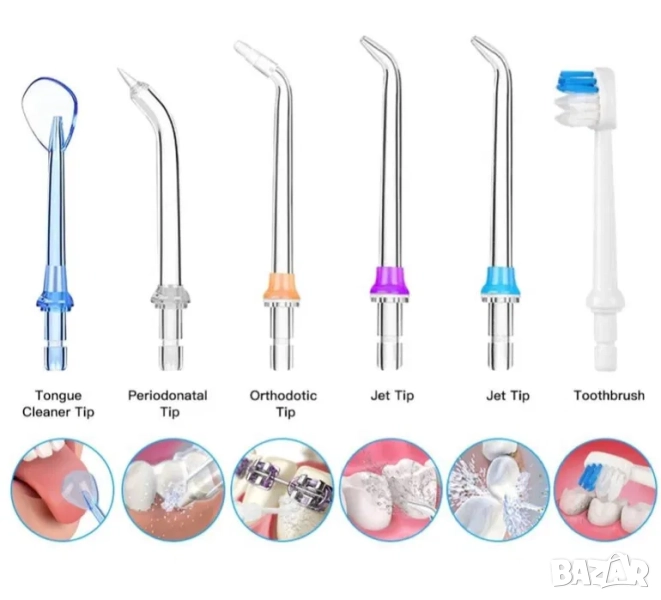 Електрическия душ за зъби H20floss, предлага 8 броя мултифункционални струйни накрайника за поддържането на вашата перфектна дентална хигиена. Тези 8 броя сменяеми глави са с възможност за въртене на 360°, което помага за по-доброто почистване на зъбите, дори и на най-трудно достъпните места.