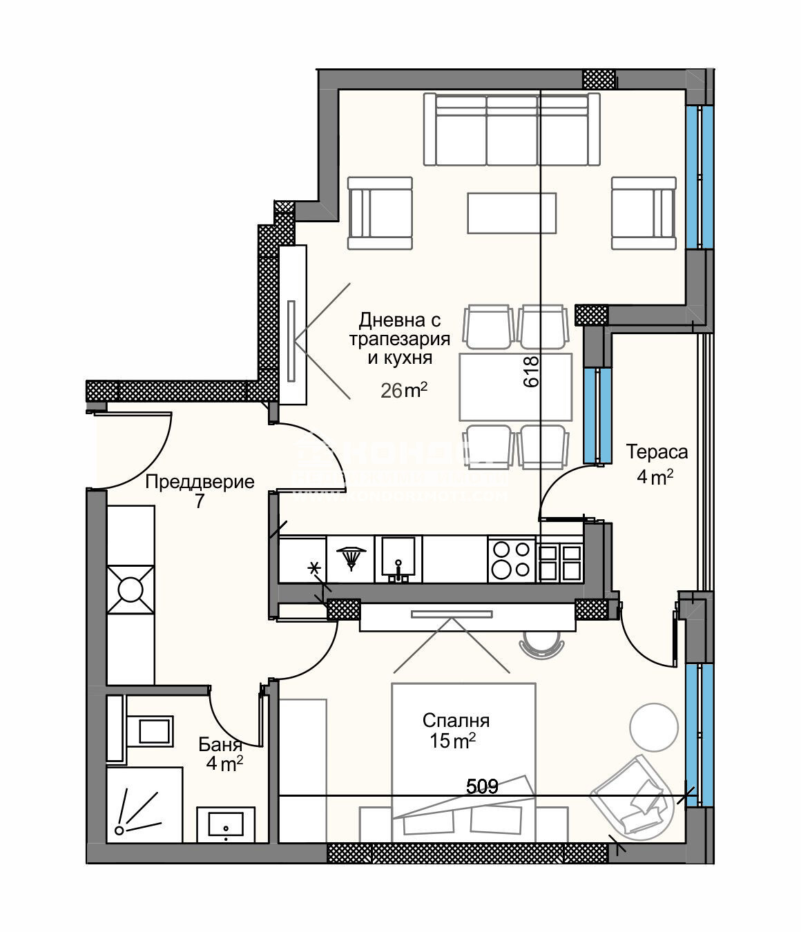 Оферта 64624: Предлагаме Ви възможността да закупите стилно завършен и дизайнерски обзаведен просторен 2 - стаен апартамент в луксозна жилищна сграда с модерна визия, проектиран да създаде максимален комфорт и сигурност на живущите в него. Основната концепция e премиум строителство, отличаващо се със съвременен архитектурен дизайн и европейска визия . Едно от основните му предимства е страхотната локация, разположен на пешеходна близост до Централна градска част. Той съчетава лукс, спокойствие и комфорт, с подсигурени подземни паркоместа. Жилището се състои от просторна източна дневна - 25.71 кв.м. , трапезария и кухненска част, една голяма и комфортна спалня с площ от 14.94кв.м., баня с тоалетна, широко входно антре с място за гардероб и опция за перално помещение и една тераса, обща и за двете стаи. Основната концепция при проектирането е да се постигнат просторни и функционални стаи, с цел да се създаде максимален уют на модерното семейство. Изключителна съвременна архитектура и модерна технология на строителство. Визията е иновативна, привличаща внимание с уникалността си. Безопасна и сигурна среда за пребиваващите допълват комфорта на сградата. Всяко жилище разполага с пълно окабеляване за домофон, интернет и кабелна телевизия, общите части са луксозно завършени, жилищата са с алуминиева дограма с троен стъклопакет от най-висок клас, масивна блиндирана входна врата. Апартамента е стилно завършен и се продава напълно обзаведен с уреди и материали от най-висок клас :- Италиански поръчкови мебели по индивидуален дизайн- Кухненска конфигурация ДИАЛОГ с уреди BOSCH, LIEBHERR и осветителни тела- тапицирана спалня по италиански модел с матрак TED ERGO COMFORT- Климатична инсталация с мултисплит система DAIKIN- Телевизори SAMSUNG- Корнизи, завеси и пердета Miroxdecor. Към апартамента има прилежашща Изба. За удобство на живущите съществува възможността да закупят подземни паркоместа с топла връзка към комплекса. Възможност за закупуване чрез Банков Кредит на изключително изгодни условия за клиенти на агенцията !!!ВИЖТЕ ОЩЕ ИЗГОДНИ ОФЕРТИ НА https://www.kondorimoti.com/ С ЕЖЕДНЕВНА АКТУАЛИЗАЦИЯ!
