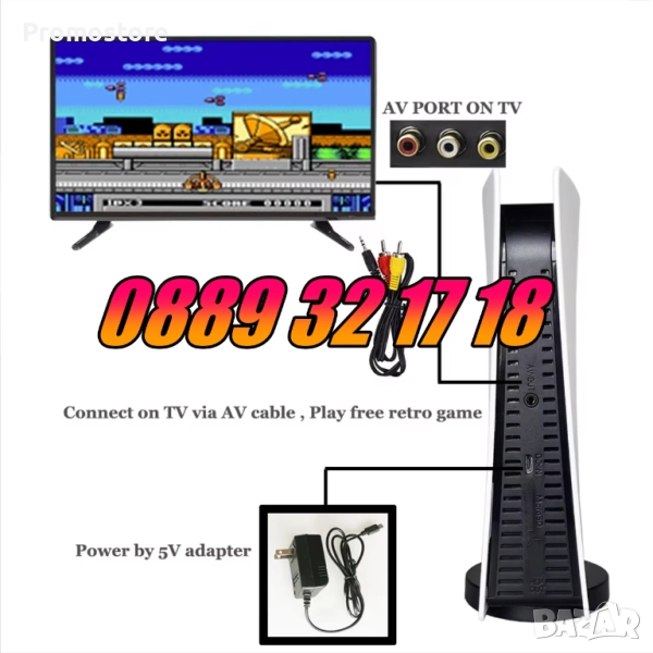 Конзолата има ТВ изход, който ви позволява лесно да я свържете към телевизора у дома чрез AV кабел и да се наслаждавате на любимите си игри на по-голям екран. Двата приложени джойстика ви позволяват да се наслаждавате на игрите заедно с приятел или близък човек.
