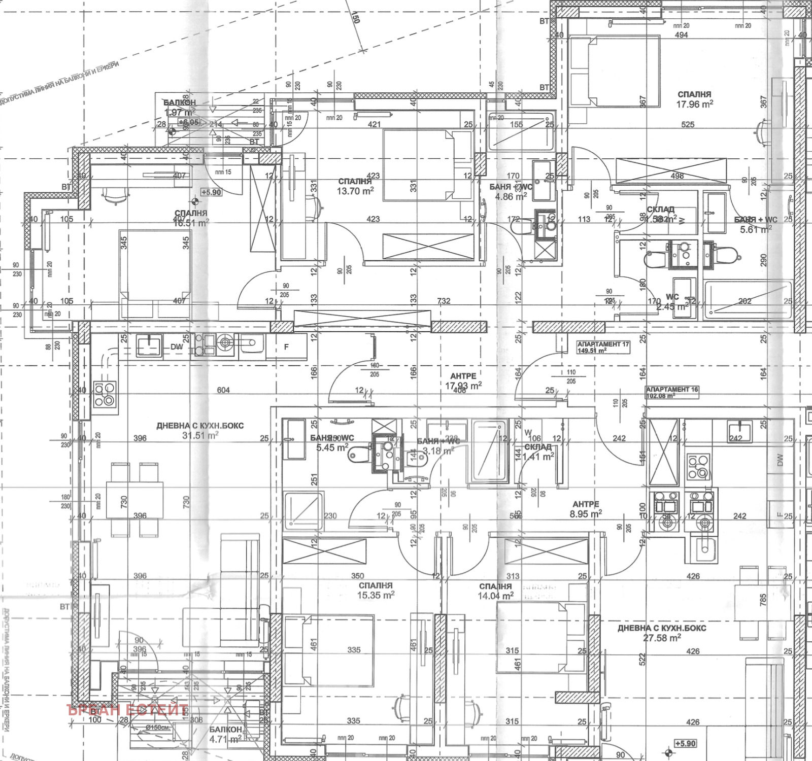 Апартаментът е 179.33кв.м. с общи части, 149.51кв.м. застроена площ, изложението е Север/ Запад, продава се на шпакловка и замазка, с изградени инсталации и висок клас дограма.