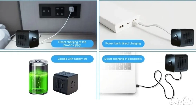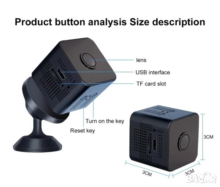 Вградена батерия и истински мини: мини камерата има вградена батерия. Това означава, че може да продължи да работи дори при прекъсване на захранването. Така че не е нужно да се притеснявате, че ще загубите важни неща. Размерът на мини камерата е много малък: 4,3 cm x 3,4 cm x 3,4 cm. С помощта на магнитна опора и лепило можете да ги монтирате върху повърхността на всеки предмет.