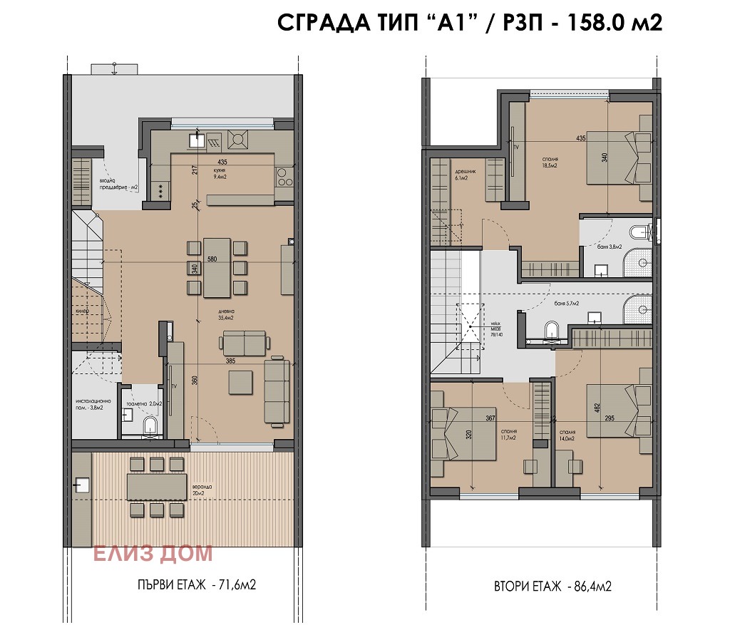 Елиз дом предлага на вашето внимание модерна къща с 3 спални, част от новоизграждащ се комплекс от затворен тип.