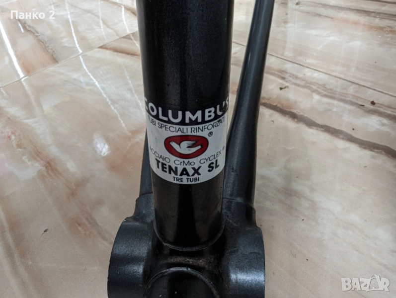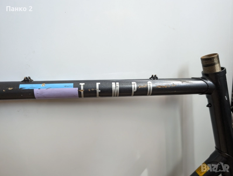 та е производството на американската фирма Schwinn, модела е Tempo , за който нямам особено информация. Рамката е с размер 59см вертикал и 57см хоризонтал измерени център-център. Рамката изглежда е направена с тръби Columbus Tenax SL. Фреймсета изглежда като среден клас изработка, прилично тегло и ковани уши. Боята е оригинална, без никакви ремонти или повреди. Средното е тип Английски стандарт, разтоянието между задните уши е 130мм. вилката ще има нужда от чашки тип англииски стандарт, седалаковото колче трябва да е 27.2мм.