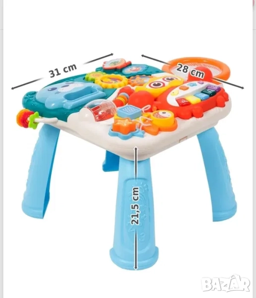 Размери като маса -37* 33 * 24 см. Размери като проходилка – 44 * 47 * 47 см. Заредете пианото с 3 батерии от 1.5 V size AAА.