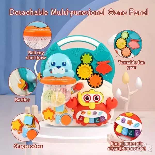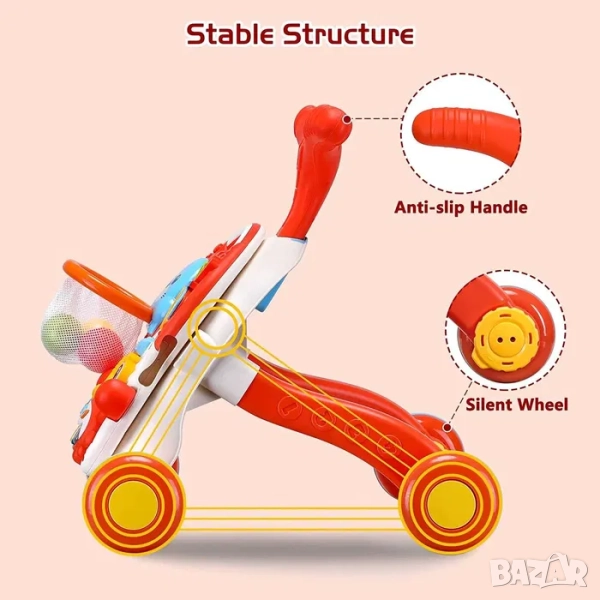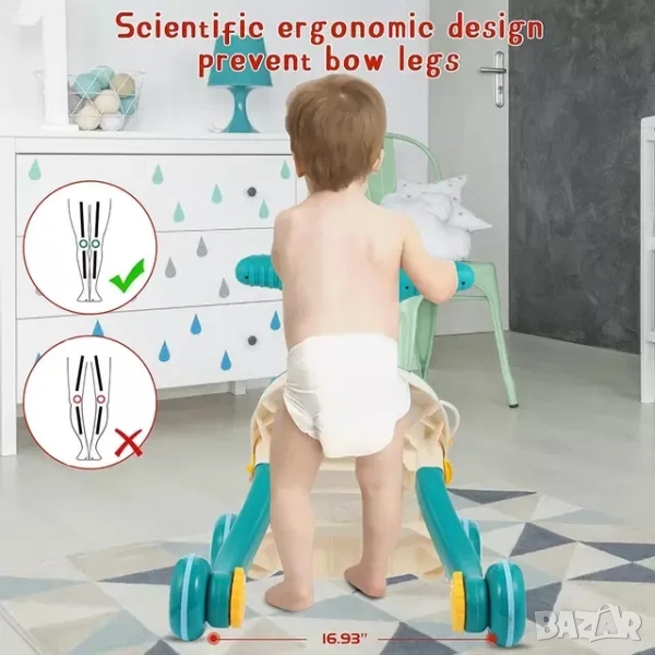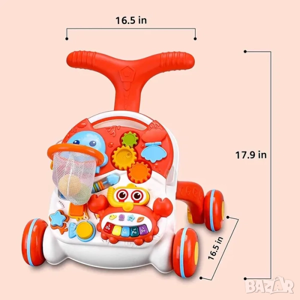 Играчката спомага за лесното прохождане и развива координацията и фината моторика.