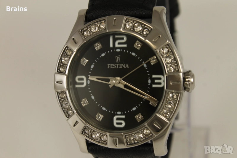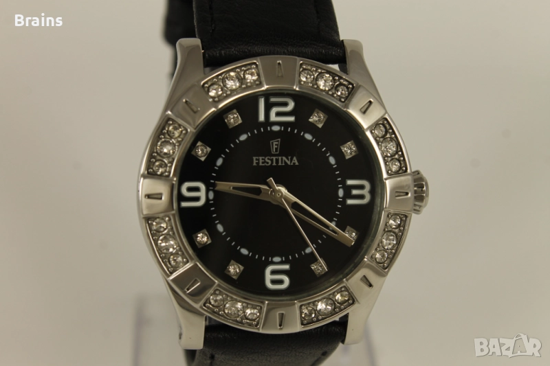 Дамски часовникFESTINAF116537 quartz. Изцяло изработен от неръждаема стомана. Циферблата и стрелките са в перфектно състояние. Стъкло без драскотини. Каса украсена с цирконии. Кварцов механизъм. Работи точно.