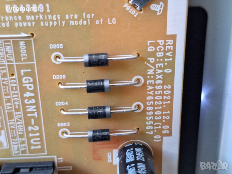 POWER BOARD ,EAX69502103(1.0),EAY65895567 за 43-инчов телевизор LG Модел 43UR78003LK , с дисплей HC430DQG-VSHA3-A14X Платката е използвана, но гарантирано работеща, демонтирана от телевизор със счупен дисплей. Тествана е от нашия техник.