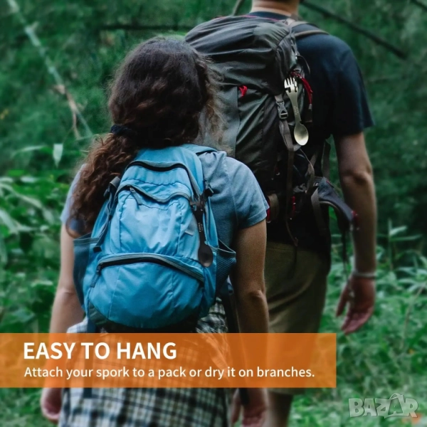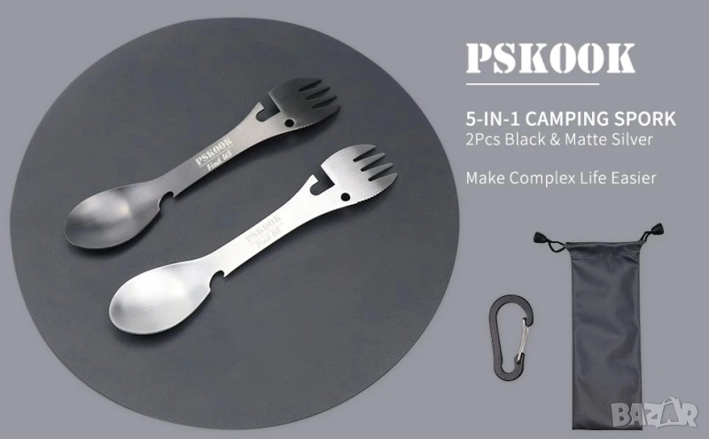 Многофункционален 5-в-1 spork с отварачка за бутилки, отварачка за консерви, вилица, нож и лъжица. Аксесоари: Включва водоустойчива чанта с връзки и карабинер за лесно носене. | Нож Spork | Вилица Spork |