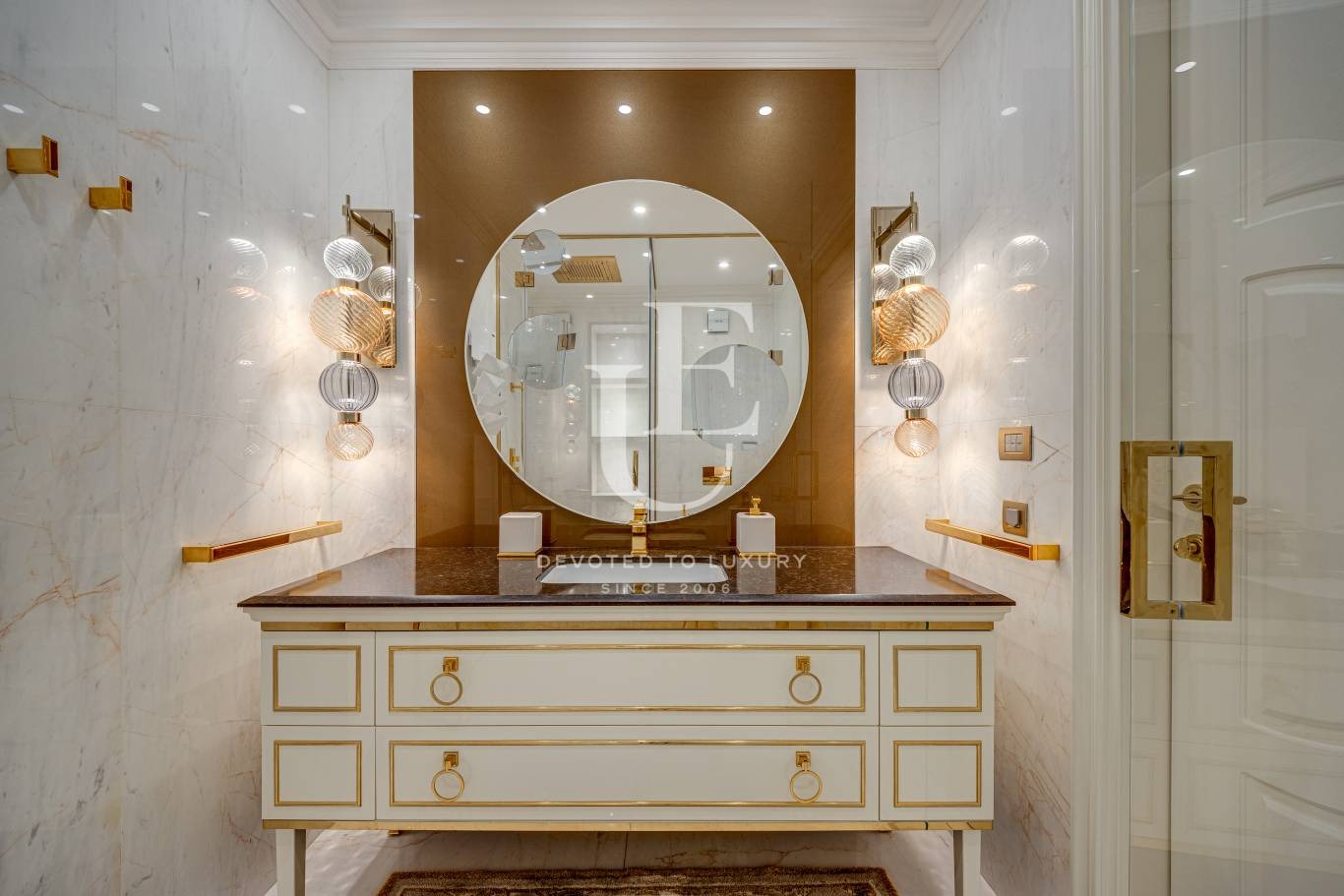 Имотът впечатлява с изискан интериор, съчетаващ естествени материали като дърво и камък, луксозно осветление и внимателно подбрани дизайнерски решения. Просторната дневна зона с панорамни френски прозорци и елегантна трапезария се свързва с голяма тераса, подходяща за релакс или събития на открито. Дизайнерската кухня е оборудвана с вградени уреди от най-висок клас, а разпределението включва три просторни спални, две луксозни бани и отделна тоалетна за гости. Апартаментът е напълно обзаведен с мебели и осветление от най-висок клас марки като Gessi, Cnelini, Giorgetti,