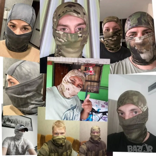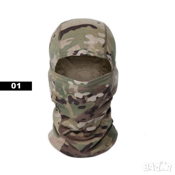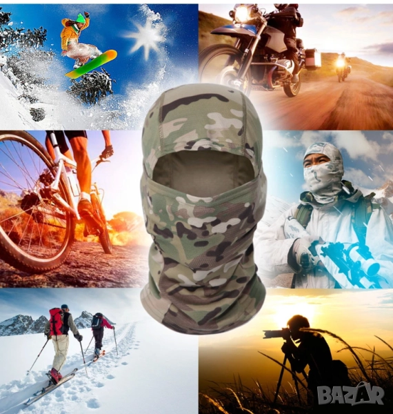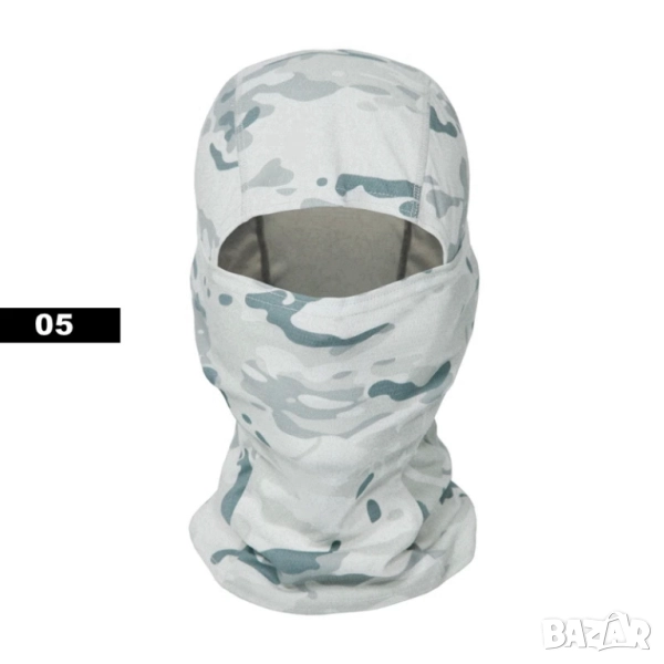 Камуфлажна балаклава с цялостно покритие на лицето (full-face / CS стил), предназначена за дейности на открито като ски, велоаксесоари, лов, paintball, airsoft, туризъм и спортове при ветровито или студено време. Балаклавата предлага защита от вятър, прах и ултравиолетови лъчи, като същевременно е лека и дишаща.