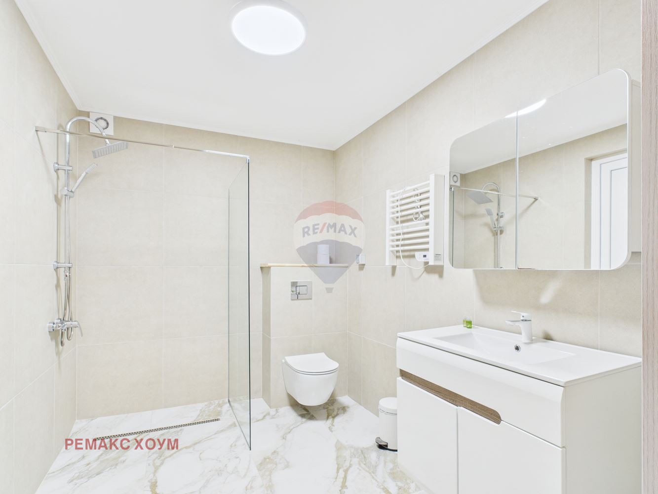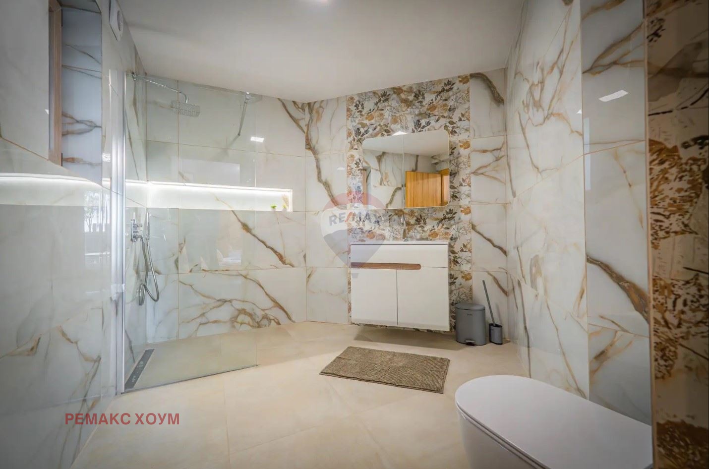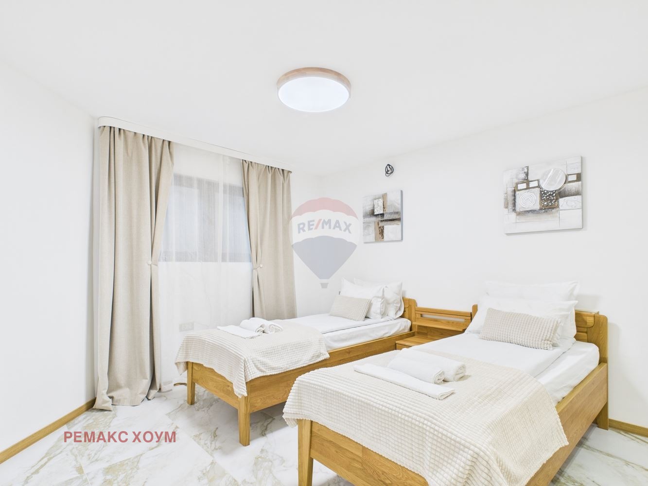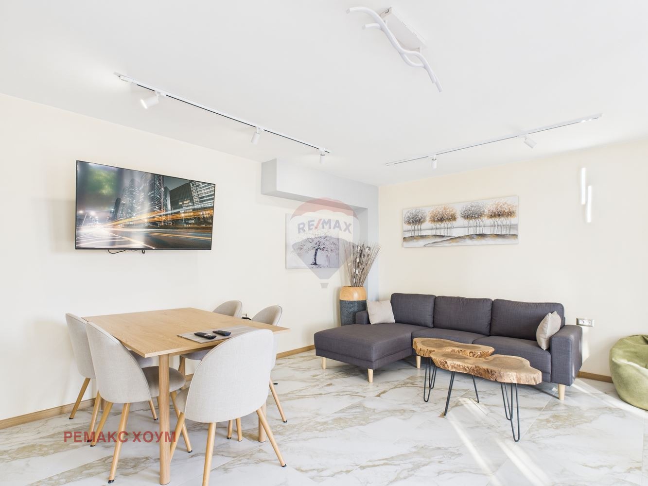 Интериорът е модерен и елегантен, с високи тавани, отворен план и изчистен дизайн, в който доминират естествени материали - дърво, камък и меки тонове, създаващи усещане за топлина и уют.