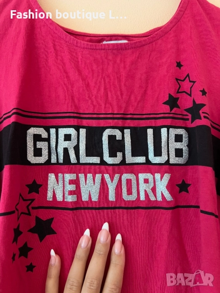 Цикламена блуза 100% памук с изрязано рамо S размер и надпис Girl Club New York 🩷🩷🩷 → Обява 52166402