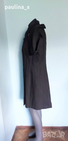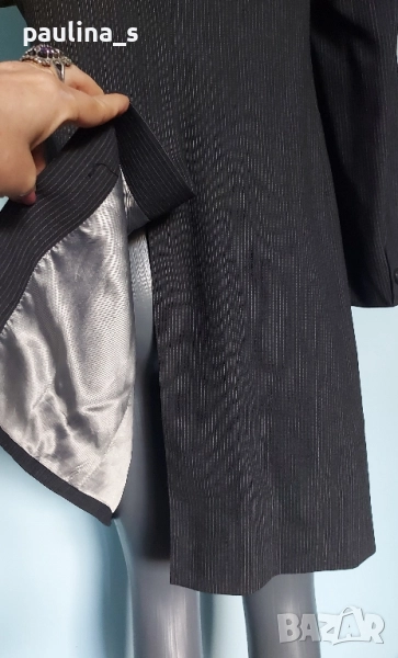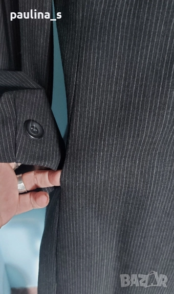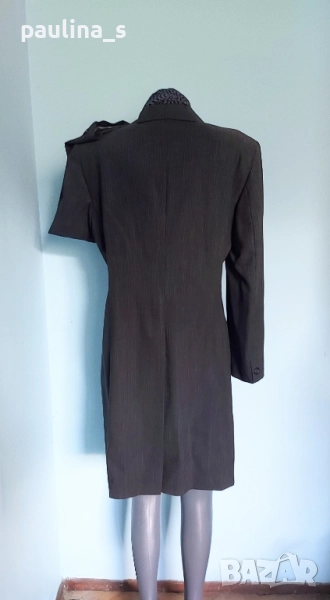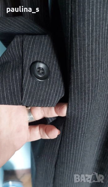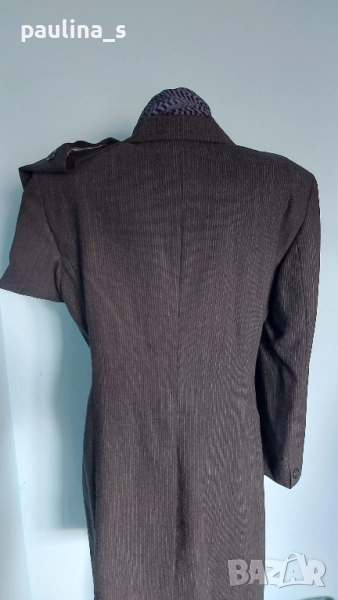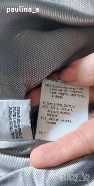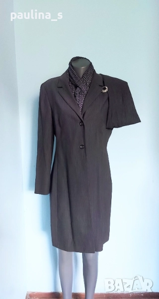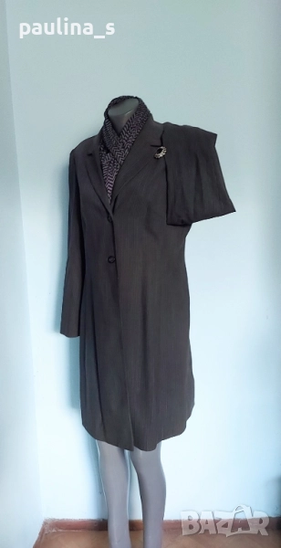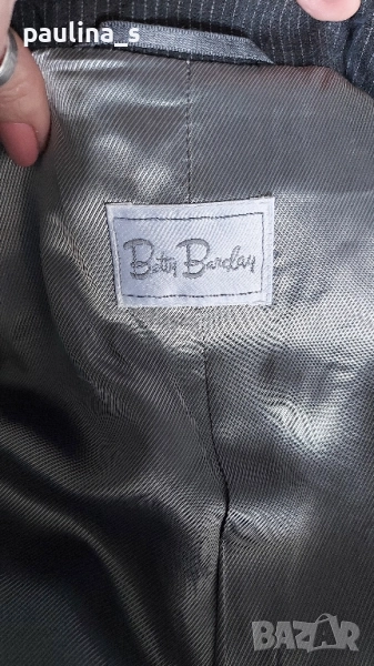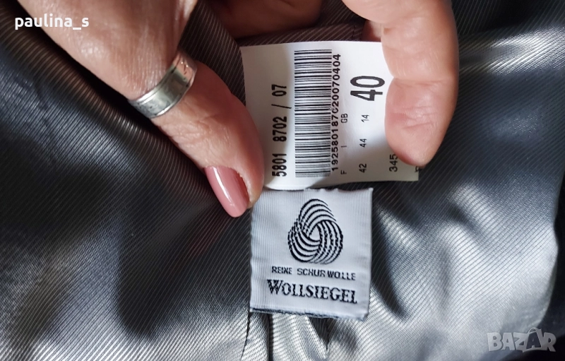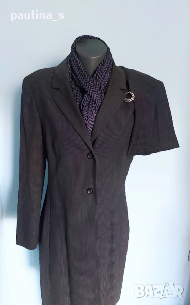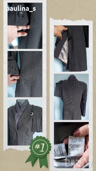 1️⃣. Колаж / L / XL - "Betty Barclay". Цената е крайна, без пазарлъци 50 евро. Дамско преходно манто, като елегантна визитка. Цветът е "графит" с дискретни вертикални бели райета, материята е 100% pure cashmire wool с много финна текстура и съответния етикет за автентичност на материята. Моделът е обран и изчистен, придаващ изтънченост и стил на притежателката. Джобовете са с неразшити фабричните тегели, закопчаването е високо с 2 бр копчета подчертаващо красотата на бюста. Превъзходна дреха, присъща на бранда, класика в жанра.