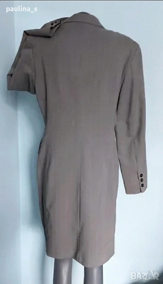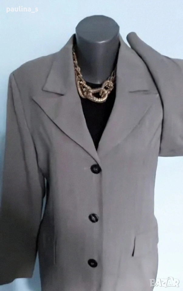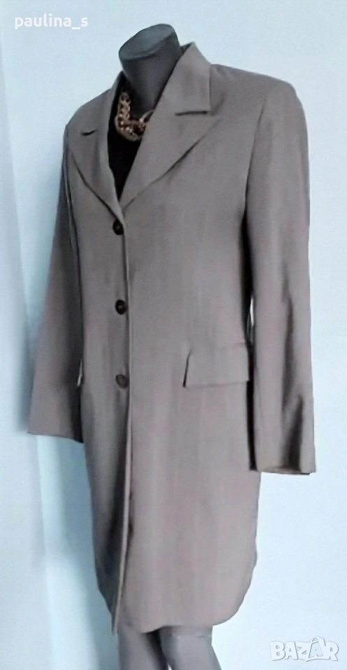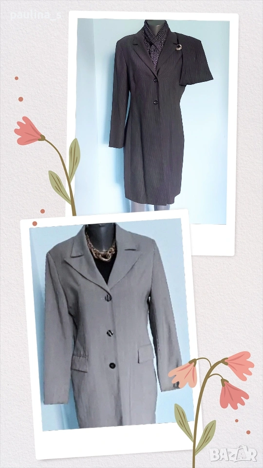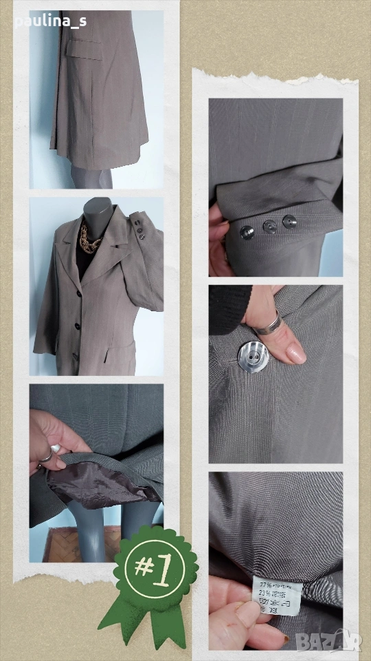 1️⃣. Колаж / L / XL - "Betty Barclay". Цената е крайна, без пазарлъци 50 евро. Дамско преходно манто, като елегантна визитка. Цветът е "графит" с дискретни вертикални бели райета, материята е 100% pure cashmire wool с много финна текстура и съответния етикет за автентичност на материята. Моделът е обран и изчистен, придаващ изтънченост и стил на притежателката. Джобовете са с неразшити фабричните тегели, закопчаването е високо с 2 бр копчета подчертаващо красотата на бюста. Превъзходна дреха, присъща на бранда, класика в жанра.