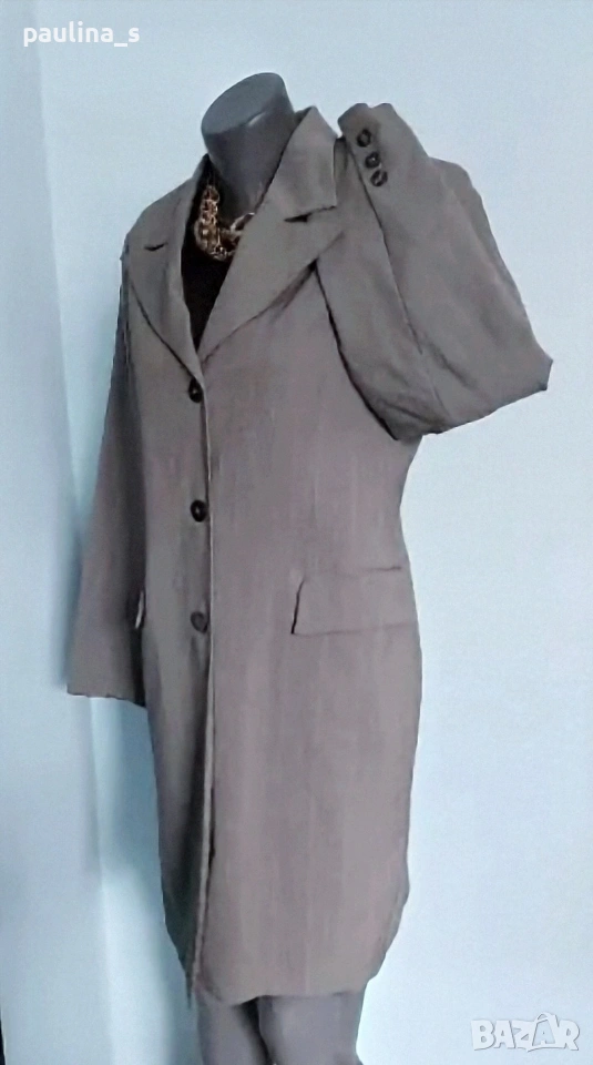 2️⃣. Колаж / L / XL Преходно манто / Еднореден блейзър "Clarisse"design. Цената е крайна, без пазарлъци 25 евро. Дамско едноредно преходно манто, издължен и втален силует, материята е еластичен габрдин, подходящо е за пролет / есен. Цвят неутрален в райе. Дрехата е с втален и издължен силует, не преходен модел. Изискан аутлук! Без дефекти. Колието е подарък, ако е в наличност.