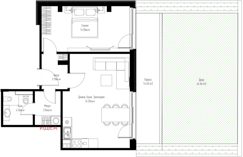Разполага с просторен хол с естествена светлина и самостоятелна спалня и двор, който добавя възможност за отдих и личен уют на открито. Интелигентното разпределение гарантира максимално използване на пространството.