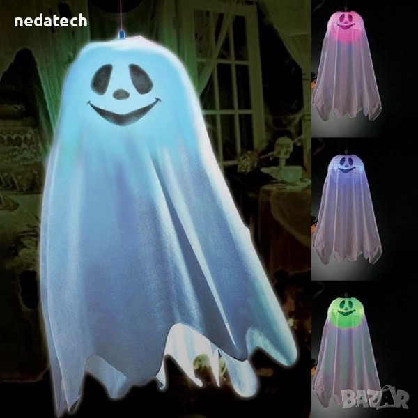 Декоративен реалистичен призрак с цветна светлина в син, зелен, лилав и розов цвят. С лесното сглобяване можете да го окачите нависоко. Работи с 3 батерии LR1130 (включени в комплекта).