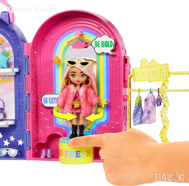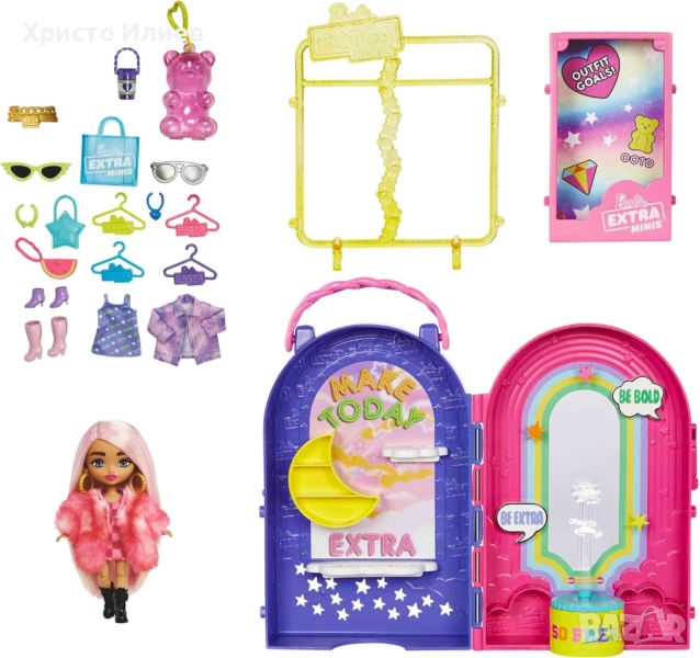 - В допълнение, комплектът включва ексклузивна кукла Barbie Extra Minis. В огромното си розово палто от изкуствена кожа и карирана рокля с черни ботуши, тя изглежда невероятно модерна.