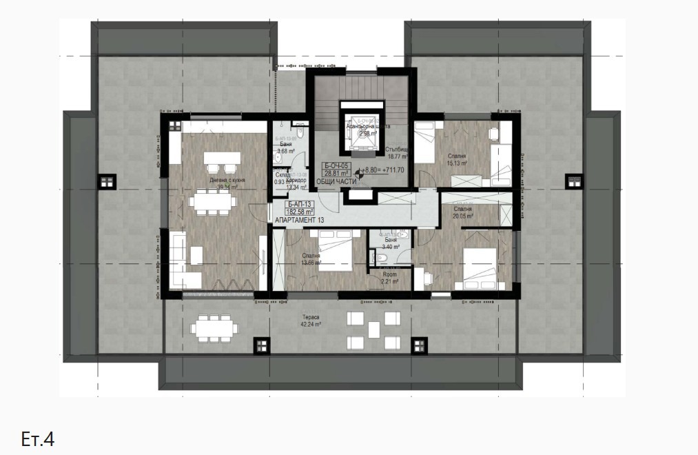 Представяме четиристаен апартамент сграда Б АП. 13 на четвърти етаж с обща площ 211,3 кв. м.; чиста площ 182,46 кв. м. със следното разпределение: коридор, всекидневна с кухненски бокс, три спални, две бани с тоалетна, склад и панорамна тераса.