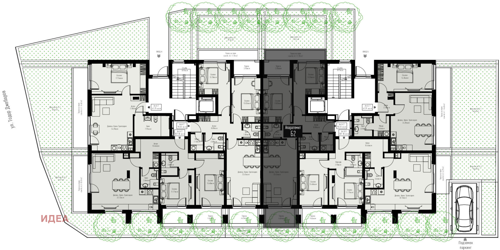 - Подземни гаражи, предлагани отделно.
