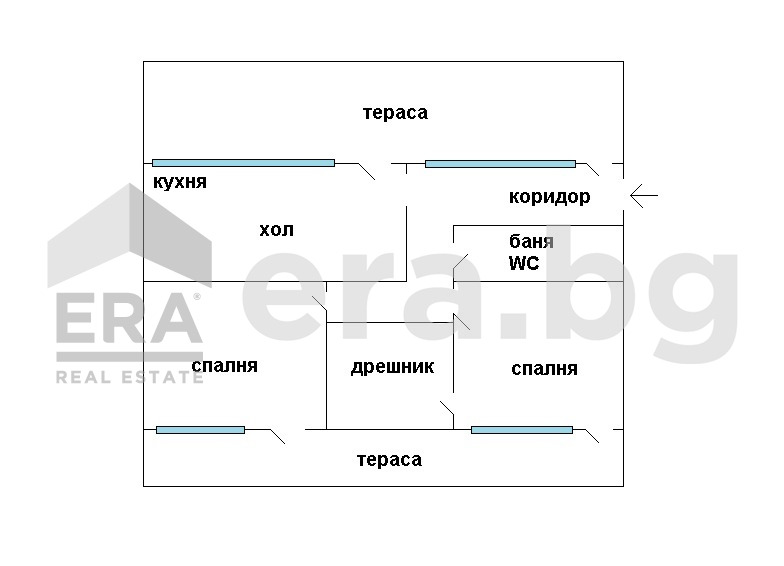 Имотът се състои от: коридор, хол с кухня, две спални, дрешник, баня с тоалетна, две тераси.