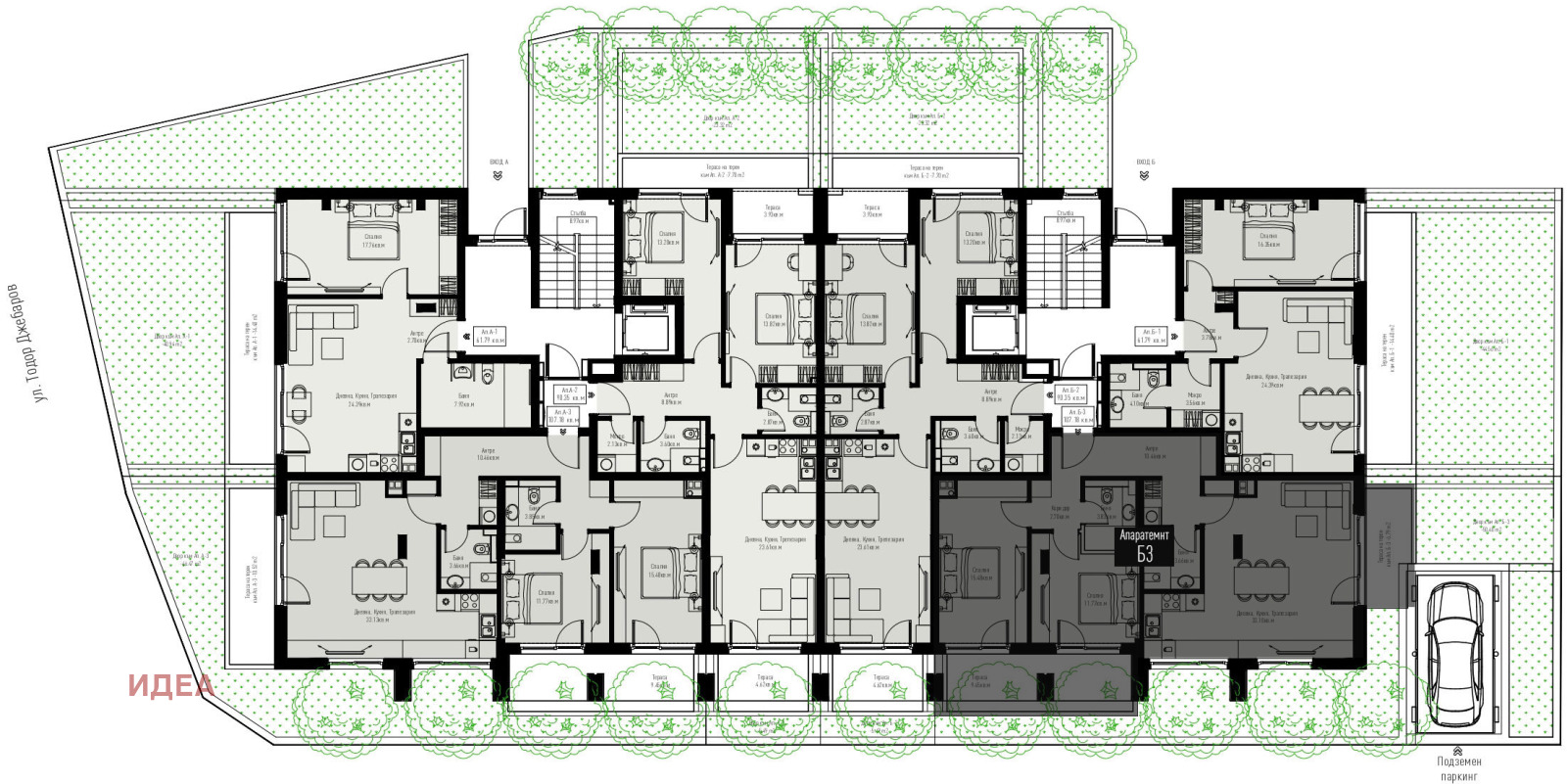 - Подземни гаражи, предлагани отделно.