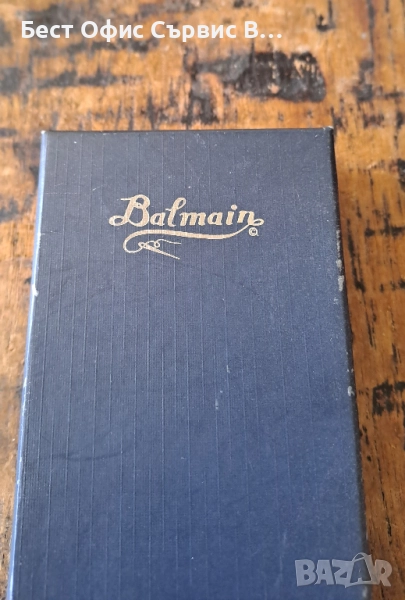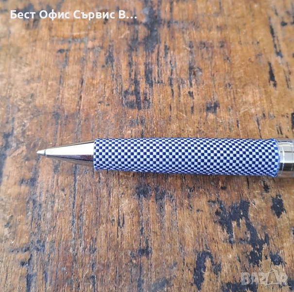 Продавам химикалка Balmain Paris Балмейн Париж сребърна с текстил тяло на синьо-бели шарки. Произведена във Франция. Включва се със завъртане. С пълнител тип "Parker" и сертификат. В оригиналната кутия, която има няколко малки драскотини и е с размери 7.4x18x2.5 см. Много рядка. От частна колекция. За ценители .